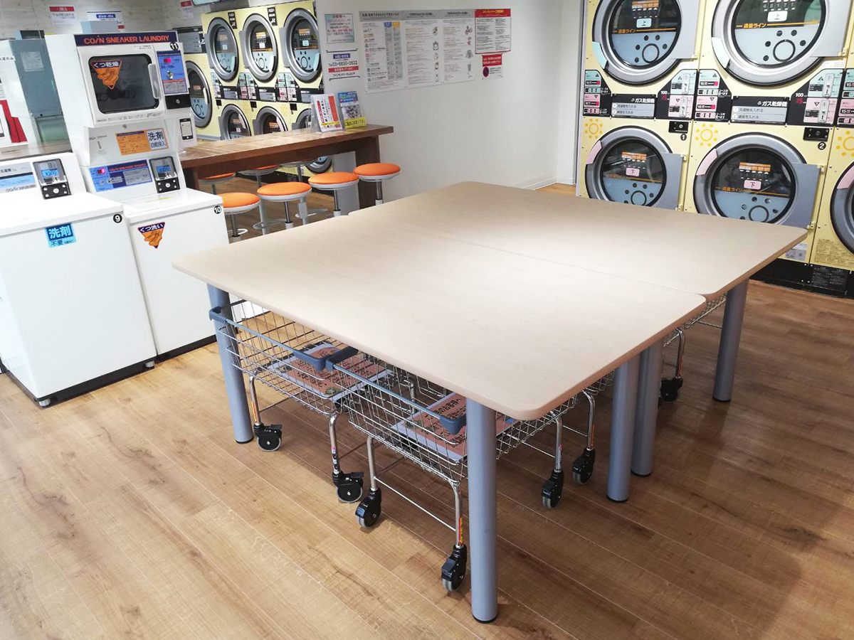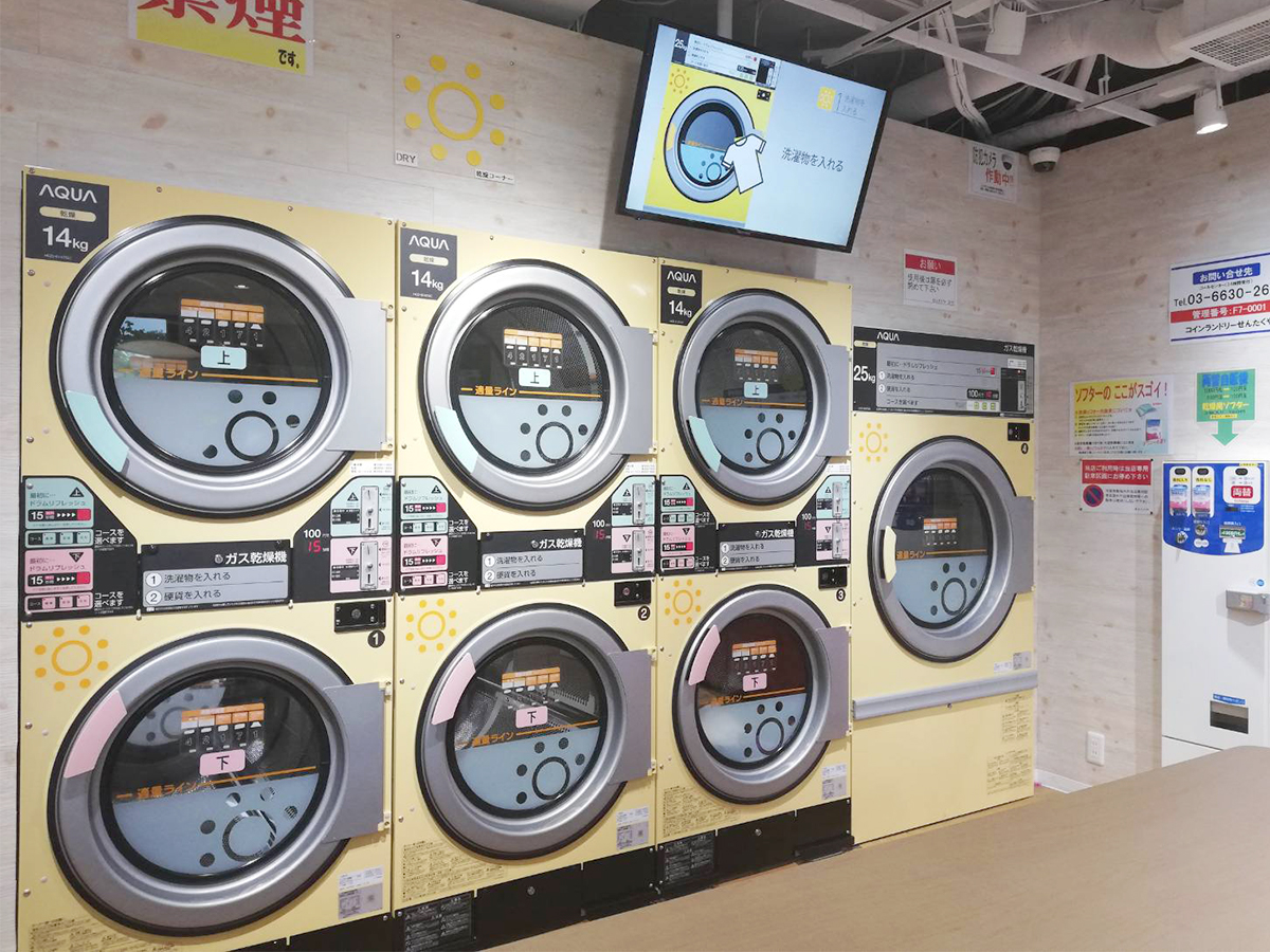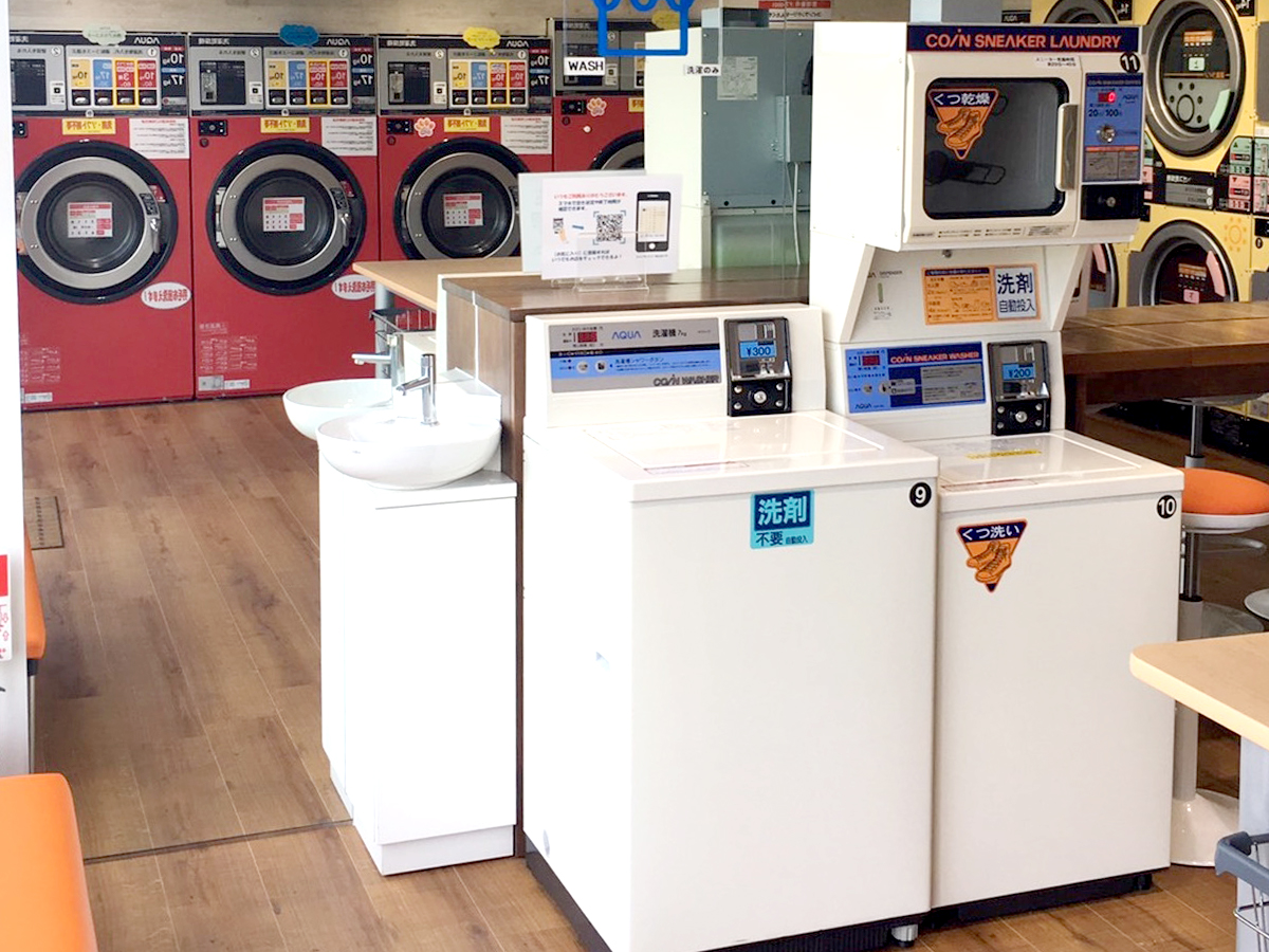 店内は大型の全自動洗濯乾燥機からスニーカーランドリーまで、幅広い設備を揃えております。ファーファ柔軟剤コースなど、嬉しい機能もございます。清潔感のある店内で是非素敵なランドリーライフをお送りください。